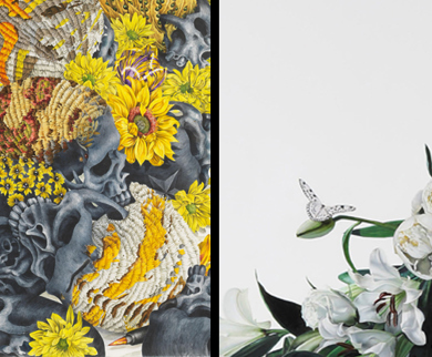 Artworks: eX de Medici / Skinny Day Ambush (Super Family) (detail) 2007 / Watercolour on paper / Collection: Museum of Old and New Art (MONA), Hobart / © eX de Medici / Photograph: Jesse Hunniford Michael Zavros / White peacock (detail) 2017 / Neil Balnaves Estate, Sydney / Balnaves Collection / © Michael Zavros